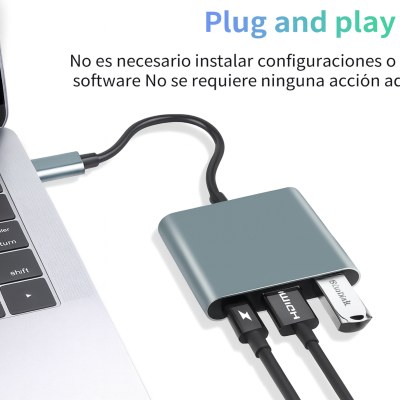 3. **Puerto Power Delivery (PD)**: Permite cargar tu dispositivo mientras lo usas. Soporta una **potencia de carga de hasta 60W**, lo que permite mantener la batería de tu laptop o teléfono cargada mientras usas el adaptador.