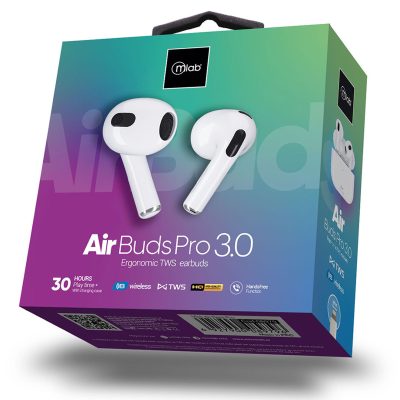 *Imagen Referencial* ¿Cansado de auriculares incómodos? Con el Air Buds pro 3.0, podrás disfrutar de tu música y tus llamadas durante mucho más tiempo sin sacrificar comodidad. Gracias a su diseño ergonómico, olvídate de las molestias y sumérgete en la música como nunca antes. Características técnicas: Bluetooth version 5.3. Encendido automático. Emparejamiento automático. Controles táctiles. Diseño ergonómico. Led indicador de estado de carga. Modo de baja latencia. Micrófono integrado, con recepción mejorada del audio. Resistencia a la humedad Denominación: IP55. Tiempo de uso audífonos 5 horas de tiempo de reproducción (Atención: Tiempos indicados de duración en uso de audífonos y cargas proporcionadas por la base, son aproximados, basados en 50% del volumen El tiempo total de reproducción indicado incluye; carga inicial de los audífonos más las cargas proporcionadas por la base de carga). Estuche de carga 5 cargas adicionales (Atención: Tiempos indicados de duración en uso de audífonos y cargas proporcionadas por la base, son aproximados, basados en 50% del volumen El tiempo total de reproducción indicado incluye; carga inicial de los audífonos más las cargas proporcionadas por la base de carga). Fuente de Alimentación: Carga USB 5V vía conector Lightning. Micrófono: Con función manos libres, compatible con asistentes de voz Google o Siri.