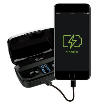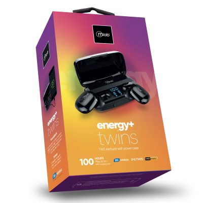 *Imagen Referencial* Audífonos energy+ Twins, con base de carga de alta capacidad y slot USB con función banco de energía. Son ideales para quienes requieren de un dispositivo libre de cables, con sonido de calidad al escuchar música desde smartphones, permiten contestar llamadas y acceder a carga para otros dispositivos, en todo momento. Características técnicas: Bluetooth version 5.3, Encendido automático, Emparejamiento automático, Controles táctiles, Diseño ergonómico, Pantalla con indicador de estado de carga, Base de carga de 2000mAh de capacidad, Micrófono integrado, con recepción mejorada del audio, Resistencia a la humedad, Denominación: IP55, Tiempo de uso audífonos(*), 4 horas de tiempo de reproducción, Estuche de carga (Powerbank) (*), 24 cargas adicionales, Tiempo total (*) 100 horas reproducción, Fuente de Alimentación: Carga USB 5V vía conector micro USB. Micrófono: Con función manos libres, compatible con asistentes de voz Google o Siri. (*) Tiempos indicados de duración en uso de audífonos y cargas proporcionadas por la base, son aproximados, basados en 50% del volumen. El tiempo total de reproducción indicado incluye; carga inicial de los audífonos más las cargas proporcionadas por la base de carga.