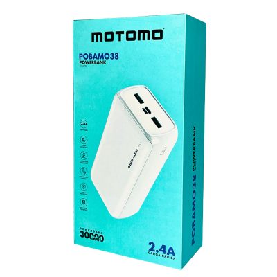 *Imagen Referencial* El Powerbank de 30000mAh es una solución de carga portátil de alta capacidad que asegura que tus dispositivos nunca se queden sin batería mientras estás en movimiento. Con su impresionante capacidad, puedes cargar tus smartphones, tablets e incluso laptops varias veces antes de necesitar recargar el Powerbank. Entrada Micro/TypeC Salidas USB-A1/USB-A2. Es tu aliado de confianza para mantener tus dispositivos cargados y listos para la acción en cualquier lugar. Con un diseño compacto y una capacidad de 30.000 mAh, esta batería portátil se adapta fácilmente a tu estilo de vida activo. Características Destacadas: Capacidad de 30.000 mAh: Con una potente capacidad de 30.000 mAh, esta Powerbank te brinda varias recargas para tus dispositivos, asegurando que nunca te quedes sin energía en momentos críticos. Puertos USB-C y Micro USB: Equipada con puertos USB-C y Micro USB, esta Powerbank es compatible con una amplia gama de dispositivos, desde teléfonos inteligentes hasta tabletas y otros dispositivos USB. Diseño Compacto y Portátil: Con un diseño elegante y compacto, esta Powerbank de Motomo es fácil de llevar contigo, ya sea en tu bolsillo, bolso o mochila, para tener energía adicional en todo momento. Lleva la Energía Contigo con la Powerbank Motomo 30.000 mAh. Recarga Rápida y Confiable en un Diseño Compacto. ¡Mantente Conectado en Todo Momento!