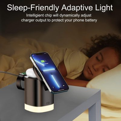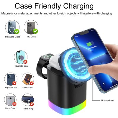 *Imagen Referencial* Estación de carga inalámbrica 3 en 1 a través de un potente imán que hace que tu iPhone 12/13/14/15/16 se alinee automáticamente y proporciona una carga precisa y eficiente. Soporte de cargador inalámbrico 3 en 1 diseño antideslizante, fuerte fuerza magnética puede sostener de forma segura tu teléfono y evitar que se caiga. La estación de carga inalámbrica 3 en 1 puede cargar vertical u horizontalmente, puedes ver películas, video chat y reconocimiento facial. Estación de carga 3 en 1 Apple puede cargar tu iPhone, iWatch, AirPods, simplemente colócalos en la superficie de carga, disfruta de una carga inalámbrica rápida 3 en 1. La estación de carga inalámbrica para iPhone es compatible con iPhone 16/15/14/13/12, 16/15/14/13/12 Pro Max, 16/15/14/13/12 Pro, 13/12 mini, para Apple Watch 7/SE/6/5/4/3/2 para AirPods Pro 2/3/Pro/2. Si quieres cargar iPhone, AirPods, iWatch al mismo tiempo, se recomienda utilizar el adaptador de corriente QC2.0/QC3.0/PD. La estación de carga para múltiples dispositivos Apple con diseño plegable y elegante, características ligeras y que ahorran espacio hacen que sea fácil de poner en tu bolsa y llevarla a cualquier lugar. La lámpara LED de base de carga inalámbrica 3 en 1 viene con colores RGB, luz cálida, luz de marquesina, puedes apagarla en cualquier momento. Estación de carga rápida inalámbrica 3 en 1, luz nocturna suave que crea un ambiente seguro y cómodo, inalámbrico para iPhone. el cargador se puede utilizar para dormir, oficina, viajes, estudio y mucho más.