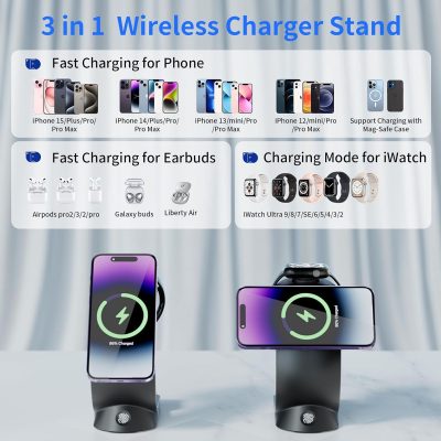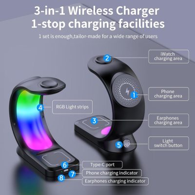*Imagen Referencial* La estación de carga 3 en 1 permite cargar teléfonos móviles, iWatch y auriculares al mismo tiempo. Puede resolver el problema de cargar diferentes productos por separado. Este cargador magnético inalámbrico mejora la succión magnética en un 50 % y fortalece la estabilidad de la succión magnética. Se puede girar 360° a voluntad cuando se utiliza para cargar y no se cae fácilmente. (Por favor, retire la funda del teléfono durante la carga, de lo contrario la función de carga se verá afectada). La carga rápida de 15 W puede mejorar eficazmente la eficiencia de carga y acortar el tiempo de carga. Cuando el teléfono está cargando, la luz indicadora se ilumina en azul. Cuando el teléfono está completamente cargado, la luz indicadora se apaga. (Al cargar, cierre los programas en ejecución en el fondo del teléfono para evitar que el teléfono lo haga de manera efectiva. Calentamiento). Luz ambiental RGB colorida, esta lámpara de noche con cargador inalámbrico tiene varios modos de color de luz. Pulse brevemente el botón táctil para cambiar al siguiente nivel de modo de luz. La fuente de alimentación puede cambiar entre diferentes modos de iluminación.
