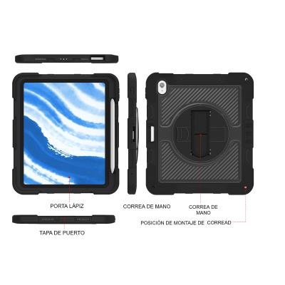 *Imagen referencial Carcasa Reforzada para 360 iPad 10.9″ (Décima Generación) Con lamina de hidrogel Matte – Correa de mano giratoria de 360° y soporte y soporte en la parte posterior, flexible en vertical y horizontal en cualquier otro ángulo, ideal para ver video, leer o enseñar, libera al máximo tu mano. Correa de mano ajustable perfectamente adecuada para todos los tamaños de manos. adultos, estudiantes, niño.Protección Máxima y Estilo Inigualable con Soporte integrado: el soporte funcional desplegable permite un fácil acceso a tus programas, películas y juegos favoritos mientras estás en movimiento Máxima Protección: Diseñada con materiales ultra resistentes, esta carcasa antigolpes absorbe impactos y protege tu iPad 10.9″ (Décima Generación) contra caídas, arañazos y golpes accidentales. Diseño Robusto y Elegante: Combinación perfecta de seguridad y estilo, con bordes reforzados y un acabado premium que mantiene tu iPad seguro sin sacrificar su estética. Soporte Integrado y Agarre Antideslizante: Disfruta de un soporte plegable ideal para ver videos, escribir o dibujar con total comodidad. Además, su diseño ergonómico evita resbalones para un mejor control. Ajuste Perfecto y Acceso Completo: Todos los puertos, botones y funciones de tu iPad permanecen accesibles sin necesidad de retirar la carcasa. Compatible con Apple Pencil, permitiendo su carga sin obstáculos.Material de alta calidad: la funda está hecha de policarbonato termoplástico de alta calidad y silicona antideslizante, para crear una protección perfecta para tu iPad. No solo a prueba de golpes/duradero, sino también cómodo al tacto