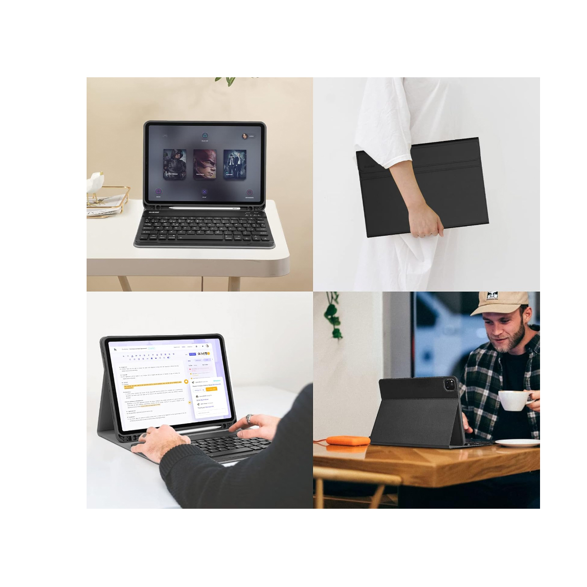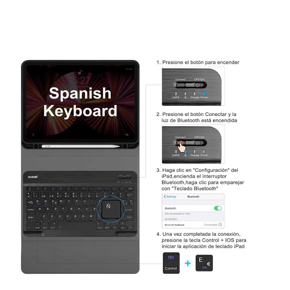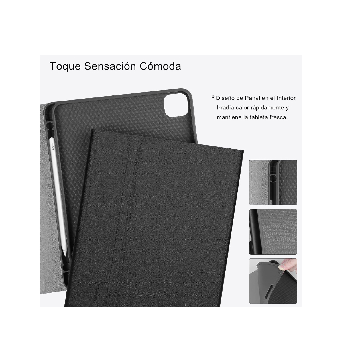 *Imagen Referencial NO INCLUYE LAPIZ …Tiene una ranura para poder colocar el lápiz táctil. Cubierta Frontal Imantada: Los imanes integrados te permitirá convertir la tapa en un soporte para posiciona tu dispositivo. Además, su material es Microfibra suave que brinda protección ante caídas y polvo. La funda Smart Cover está fabricada con una única pieza de poliuretano para proteger la parte delantera de tu iPad También lo activa cuando la abres y lo pone en reposo cuando la cierras. Puedes plegar la Smart Cover en distintas posiciones y convertirla en el soporte perfecto para leer, escribir, ver películas o hacer llamadas con FaceTime. Y es tan fácil de quitar como de poner. La funda Smart Cover está fabricada con una única pieza de poliuretano para proteger la parte delantera de tu iPad También lo activa cuando la abres y lo pone en reposo cuando la cierras. Puedes plegar la Smart Cover en distintas posiciones y convertirla en el soporte perfecto para leer, escribir, ver películas o hacer llamadas con FaceTime. Y es tan fácil de quitar como de poner.El teclado funciona vía Bluetooth.