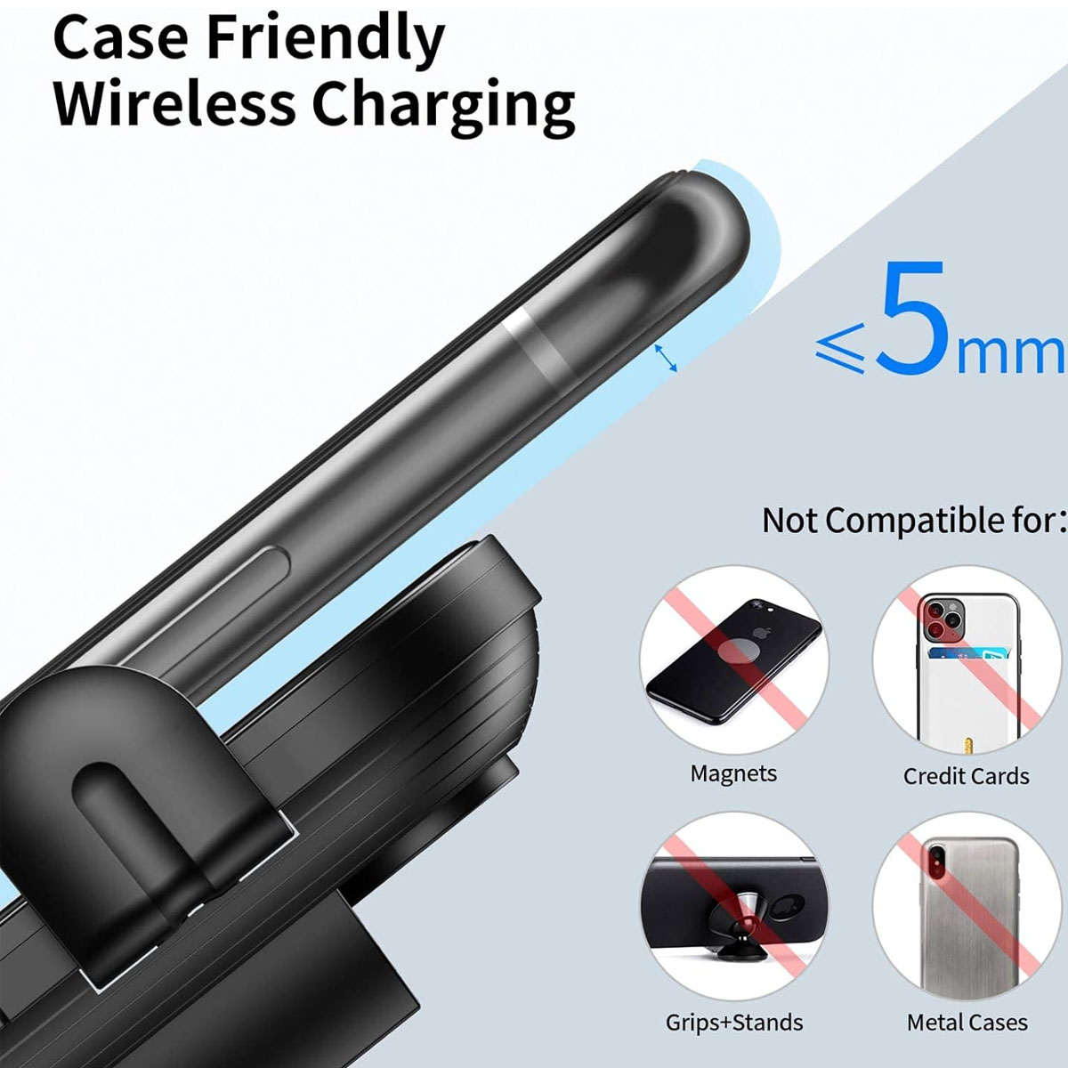 *Imagen Referencial* Especificación del soporte para teléfono inalámbrico XS Tensión/corriente de entrada: 5V/2A, 9V/1.67A.12V/1.67A. Potencia de salida: 15W.10.7.5W.5W. Potencia de carga: 110k-205kHz. Eficiencia de carga 72% Distancia de carga: 8mm. Soporte de inducción de carga inalámbrica para automóvil, adecuado para más teléfonos móviles. Cuerpo de metal fino, estructura fuerte y estable. Colocación con detección de infrarrojos con una sola mano. Aplicable a teléfonos móviles: 4,7-6,9 pulgadas Material: ABS+PC. Aviso: Si tu teléfono no es compatible con la carga inalámbrica, solo funcionará como soporte y no podrá cargar de forma inalámbrica. La carga rápida requiere un cargador de coche QC 3.0 (NO INCLUIDO), carga inalámbrica estándar de 5W para otros teléfonos con carga inalámbrica (se requiere un adaptador de 5V/2A). Características: Soporte carga inalámbrica. Soporta Auto-Clamping. Soporta carga rápida de hasta 15W máximo. Aplicación: admite todo tipo de teléfonos que admiten carga inalámbrica y se utilizan en el automóvil. Carga rápida inalámbrica de 15 W para LG V50/V40/V30/G8/G7; 10W para Samsung Galaxy S23 Ultra/S23+/S23/S22 Ultra/S22/S21/S20/Note 20/Note 10+/Note 10; 7,5 W para iPhone 15/15 plus/15 pro/15 pro max; 14/14 plus/14 pro/14 pro max/13/13 Pro/12 Pro Max/12 Pro/12/11 /11 Pro /11 Pro Max /SE /XS /X/XR/8 Plus/8.